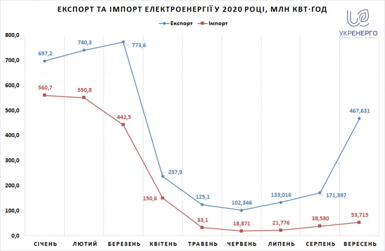 Экспорт электроэнергии из Украины в сентябре 2020 года составил 467,6 млн кВт?ч, что в 2,7 раза больше, чем в августе. Однако данный показатель меньше на 40% объема экспорта в марте 2020 года, до введения карантинных ограничений.
